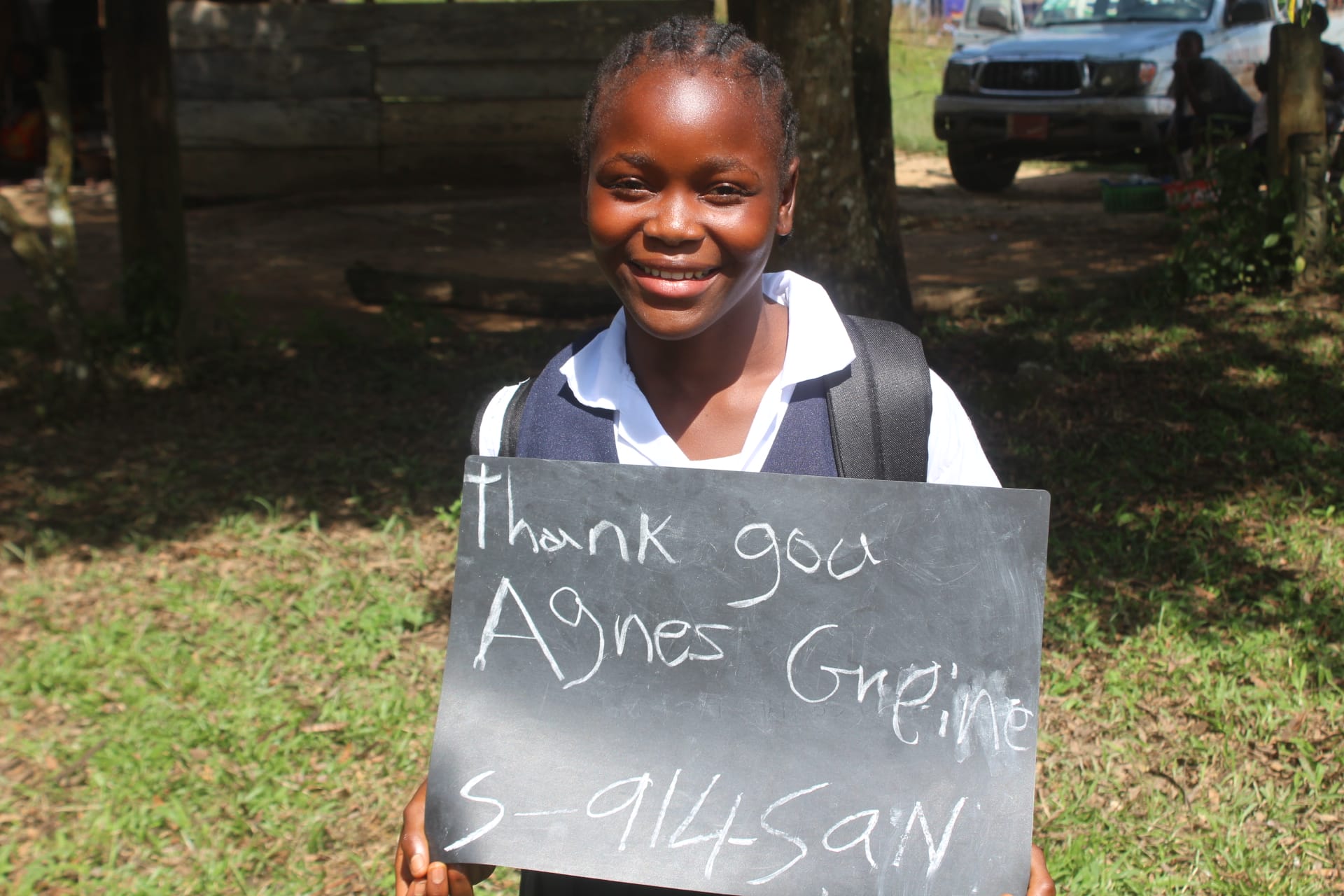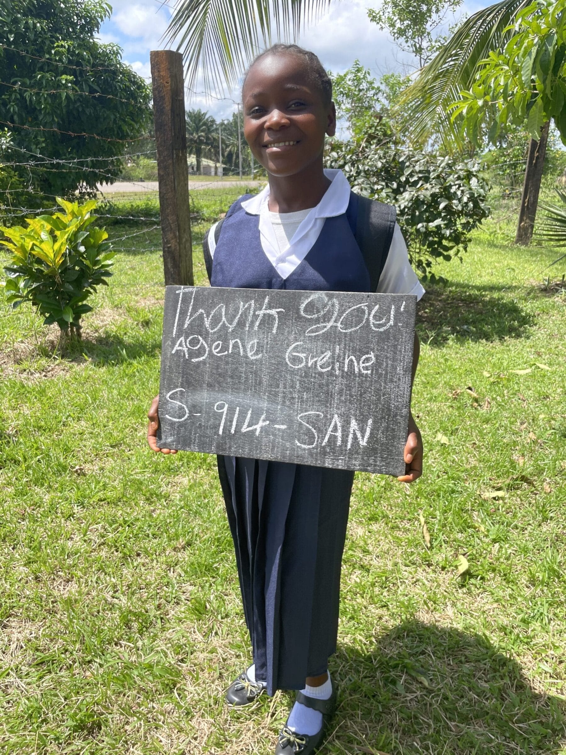 Agene is 11 years old and has advanced to the third grade this year. She lives with her grandmother, who has been her primary caregiver and source of love and encouragement. After school, Agene helps support their household by selling peanuts in her community, demonstrating her sense of responsibility and dedication to her family. Her favorite subject is English, where she enjoys reading and expressing herself through writing. Although Agene is still unsure about what she wants to do when she grows up, she remains eager to learn and make her grandmother proud. Agene’s resilience and determination are truly inspiring, and she is grateful for the opportunity to continue her education. Sponsored by: Dawn Lalley