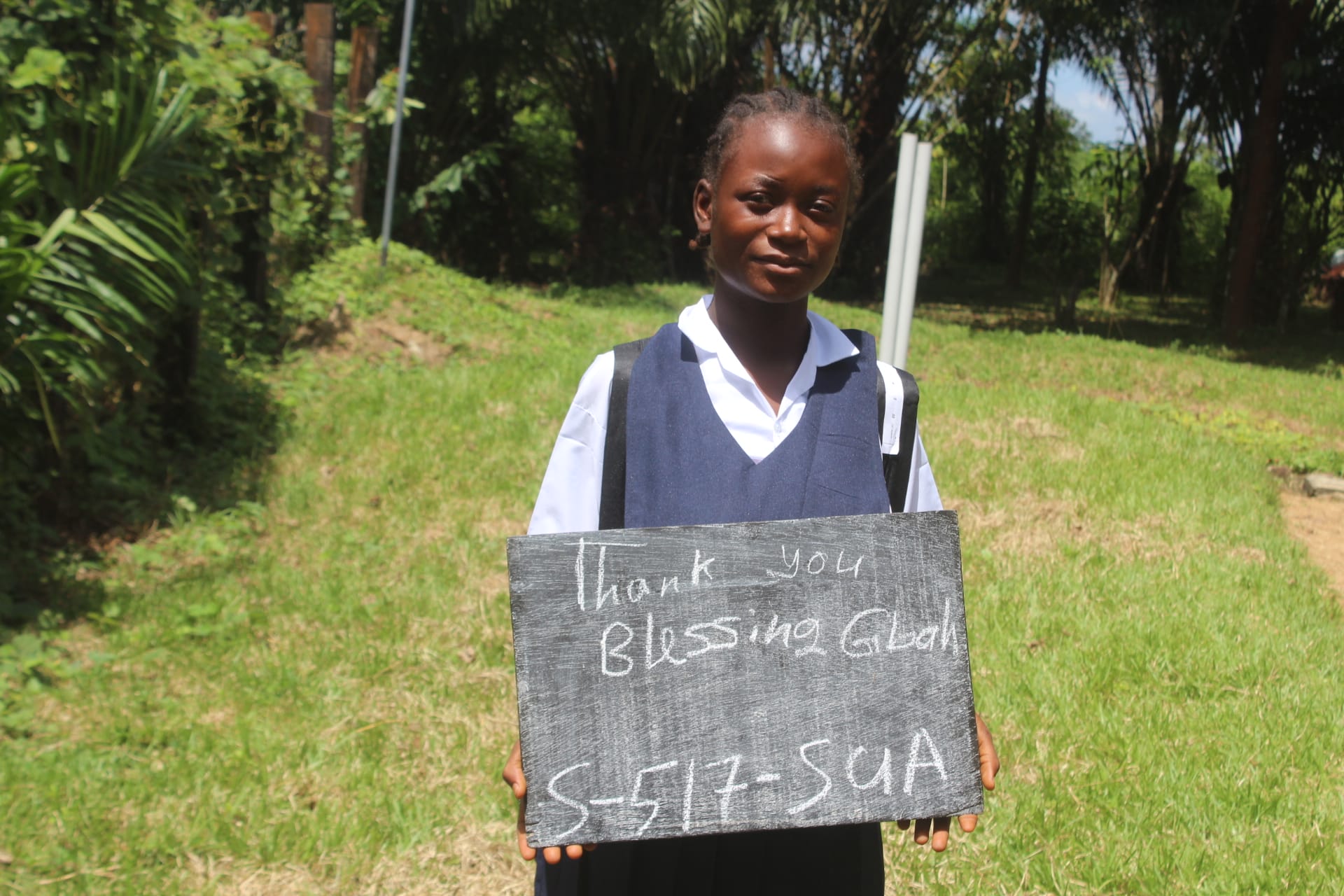 Meet Blessing, who has been generously sponsored by Parker & Michelle Connelly. She is 9 years old and is in the 1st grade this year. She lives in Suakazue Town, Liberia with her grandmother. Both parents abandoned her with her grandmother. Her grandmother is sick and unable to properly care for Blessing and her siblings. Her interests are to sell, and she hopes to be a businesswoman when she grows up.