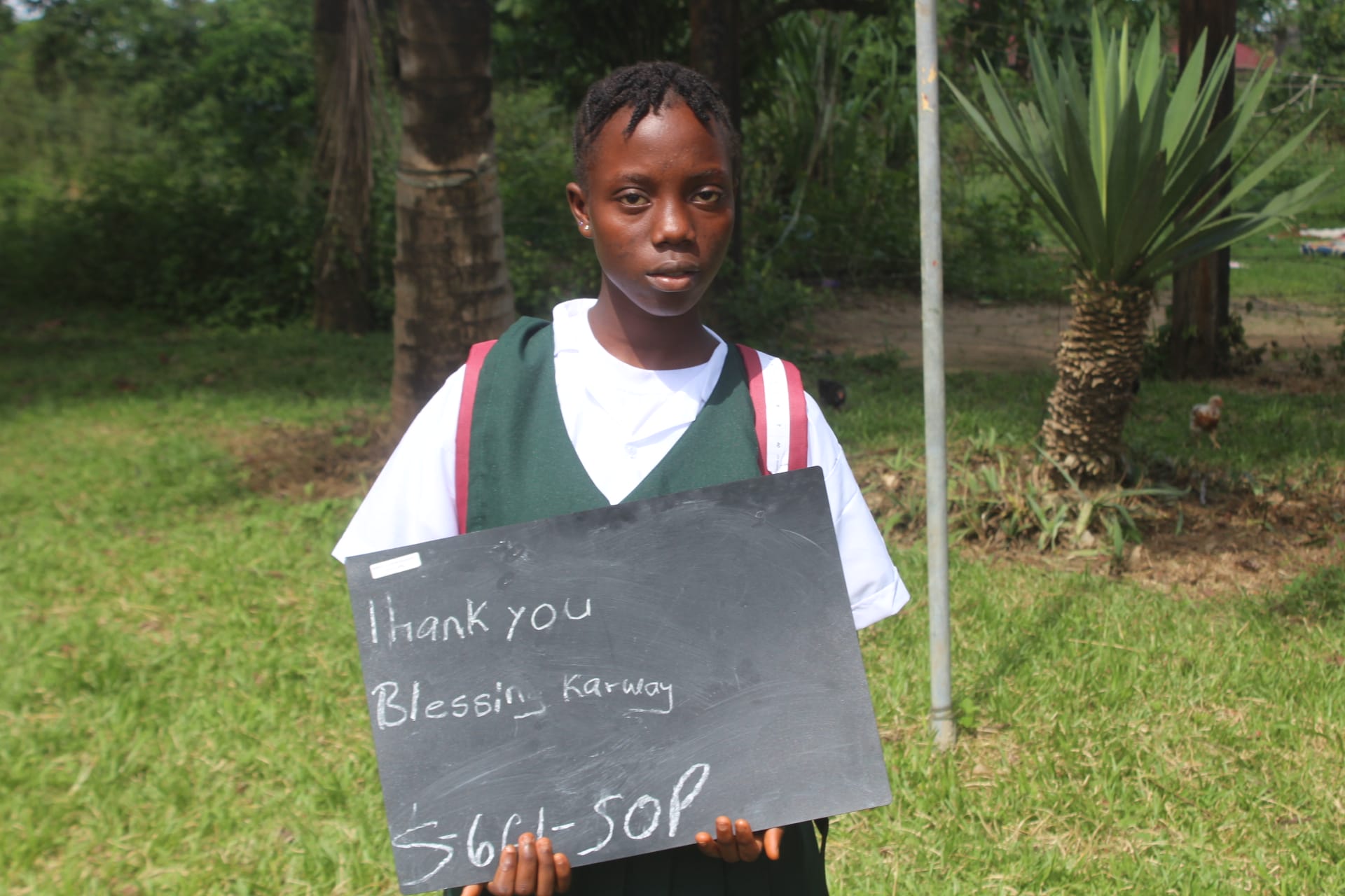 Blessing is now 16 years old and has been promoted to the 7th grade this year. She continues to live with her aunt and remains deeply committed to her education and her dream of becoming a doctor. At home, Blessing carries heavy responsibilities. After school, she goes to the well to draw water, carries it home, and then prepares the family’s meal. She shared that her family eats only once a day, in the evening, after she finishes cooking. When asked if she attends school hungry, she quietly replied, “You just learn to control your stomach. We only eat when I get home in the night.” Her strength and endurance are far beyond her years. Despite these daily challenges, Blessing remains a focused and disciplined student. Her teachers continue to describe her as serious about her studies and a positive presence in the classroom. Though she is naturally quiet, she leads by example through her hard work, respect, and determination. Blessing’s resilience is truly inspiring. She understands that education is her pathway to a better future, and she is willing to sacrifice and persevere to reach her goals. We are incredibly proud of her courage and commitment. Thank you for continuing to support Blessing and for helping her stay on the path toward her dreams. Sponsored by: Joyce Jorgensen