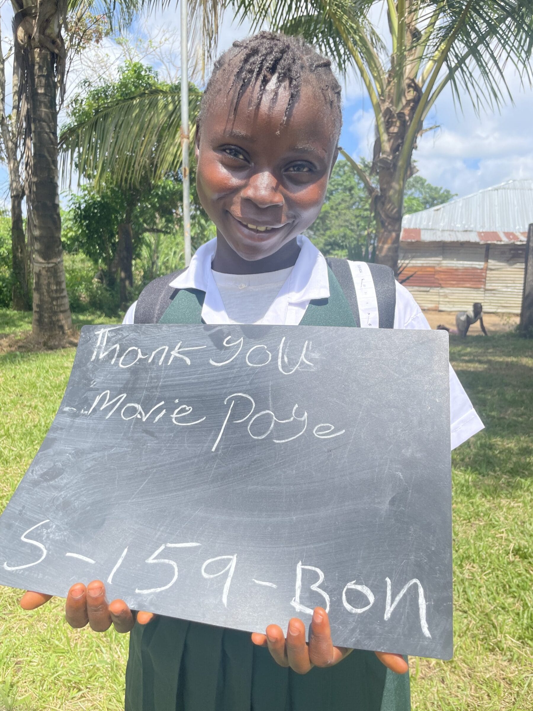 Marie has been generously re-sponsored by Lori Fischer Hall and family. She is 13 years old and was promoted to the kindergarten-2 this year. She lives in Boapea, Liberia with her uncle.